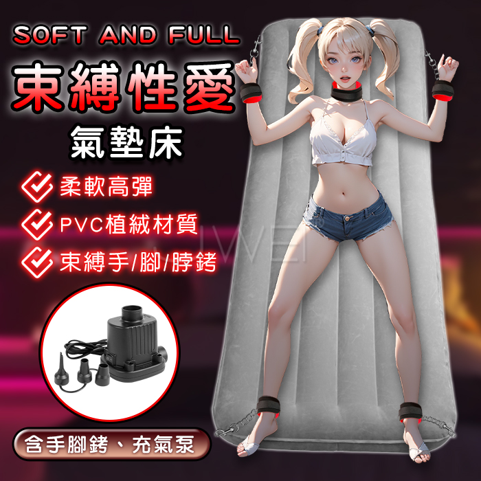 束縛氣墊床.束縛手/腳/脖銬+黑色輕柔植絨彈力性愛床墊【附贈電動打氣泵】