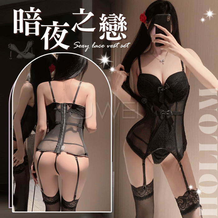 晝夜甜誘.蕾絲深V領口透視網紗暗扣開襠吊襪帶馬甲【黑色】