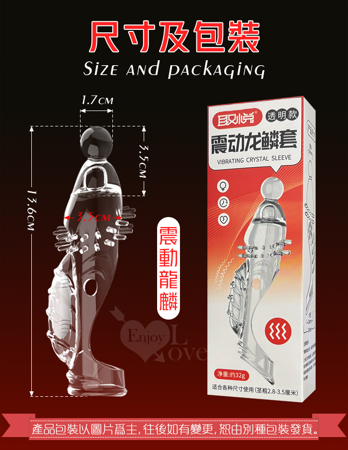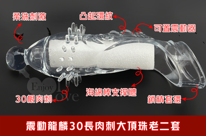 | 取悅 ‧ 震動龍麟30長肉刺大頂珠老二套~鏤空/凸點/環紋/增長增粗物理持久隱身加強套﹝透明色﹞
