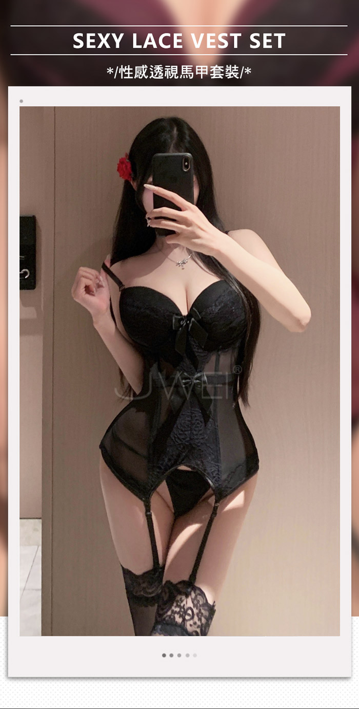 ►您現在的位置:首頁>暗夜之戀.性感蕾絲深V棉墊鋼托透視馬甲吊襪帶套裝-黑色【吊帶馬甲+T褲+吊襪帶】