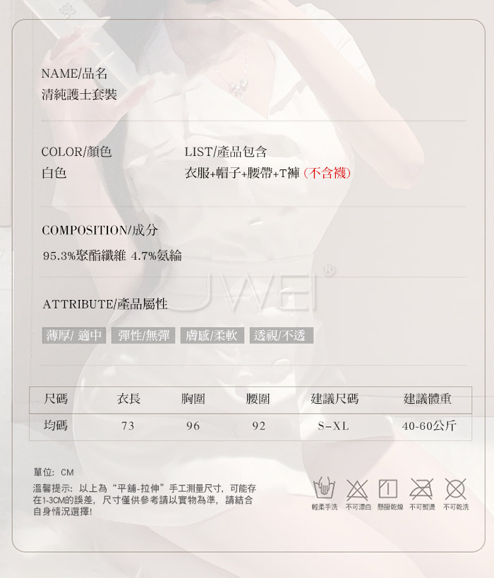■內容物:衣服+帽子+腰帶+T褲 ■適穿尺寸:FREESIZE ■彈性:無彈 ■未撐開平量尺寸正負誤差1~2cm,1吋=2.54cm ■注意事項:基於保障消費者個人衛生,此貼身衣物恕不接受退換貨。 (如為商品本身暇疵,接受七日內換貨,請勿試穿,謝謝您)