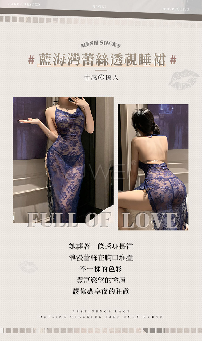 | 柔媚御姐.藍海灣純欲蕾絲蕩領 美背半露兩側開衩透視睡裙【連衣裙+T褲】