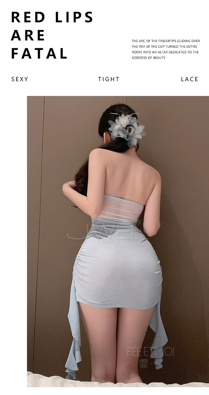 ►您現在的位置:首頁>甜欲風情.性感抹胸可拆卸玫瑰花胸針點綴抽褶包臀連身裙-藍色【連身裙+可拆式胸針+T褲】