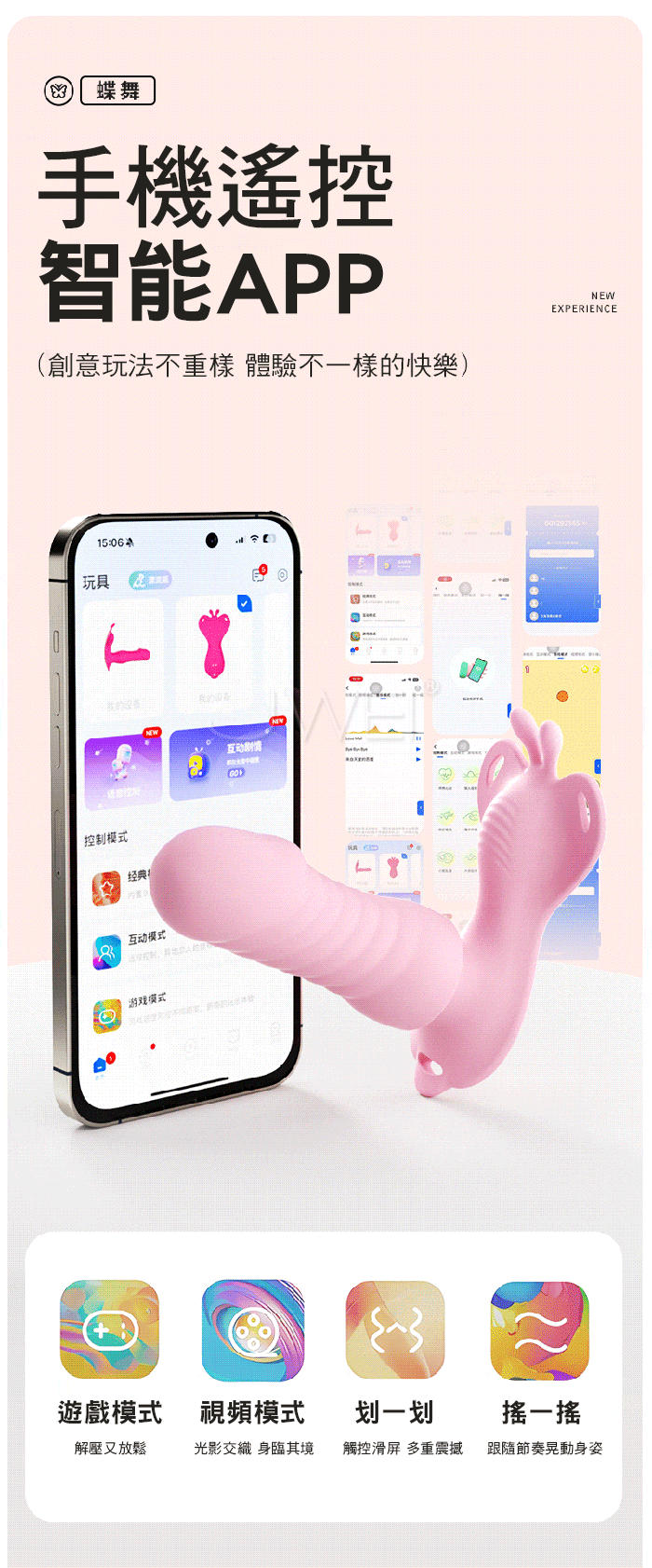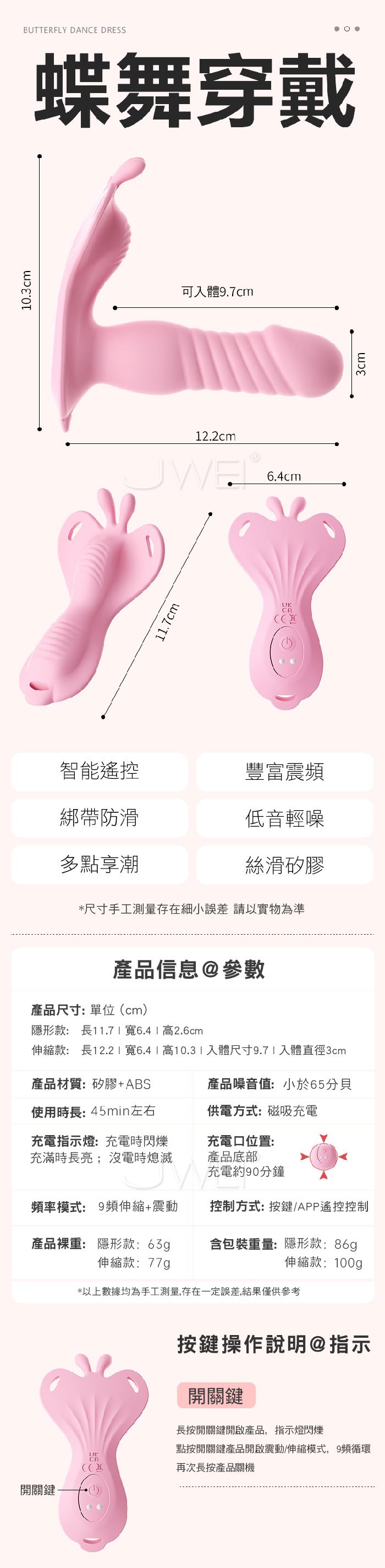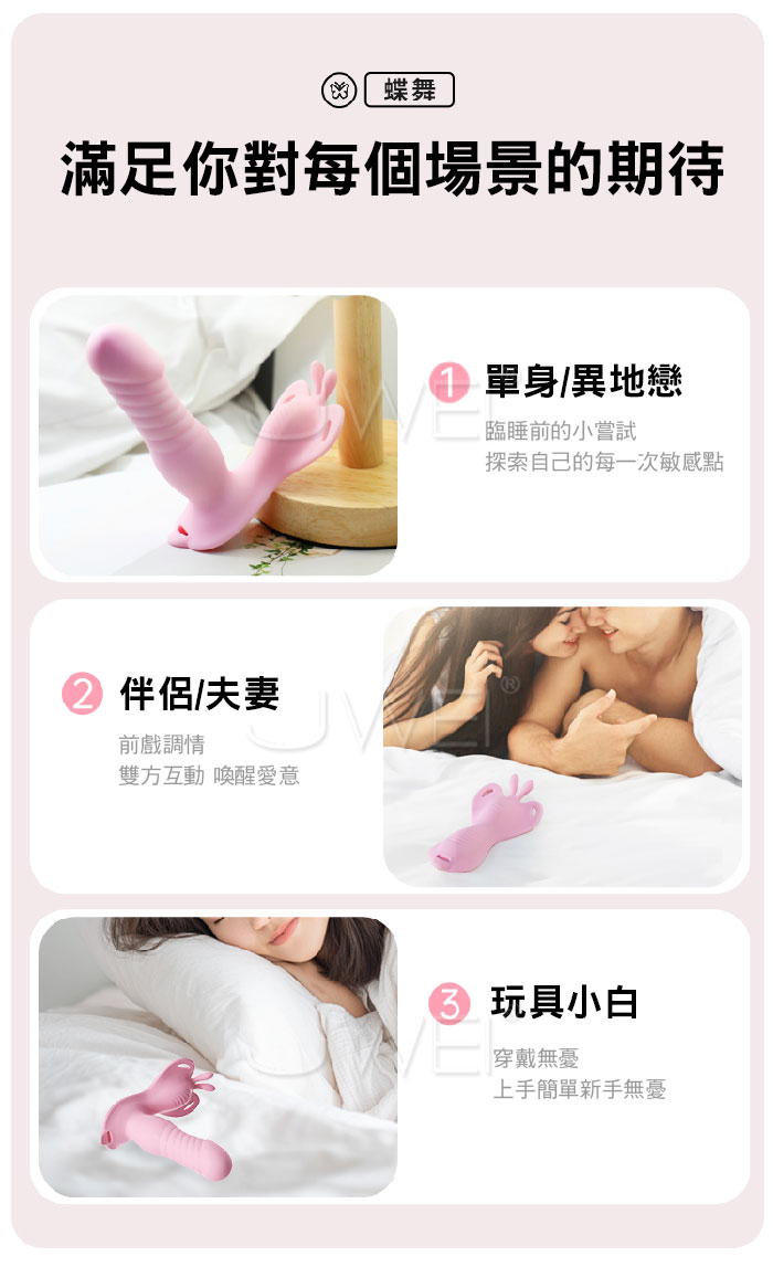 如蝶舞般,貼合肌膚,開啟私密愉悅新體驗 綁帶設計,物理固定,緊緊的抱著不脫落,集中刺激!! 手机遥控智能APP,創意玩法不重樣 體驗不一樣的快樂 3種強度6種變頻,高頻震動,萬轉高速機芯併發超強能量 ■尺寸:大小詳如圖片標示 ■材質:矽膠+ABS ■供電:USB充電 ■模式:9頻強震、APP智控