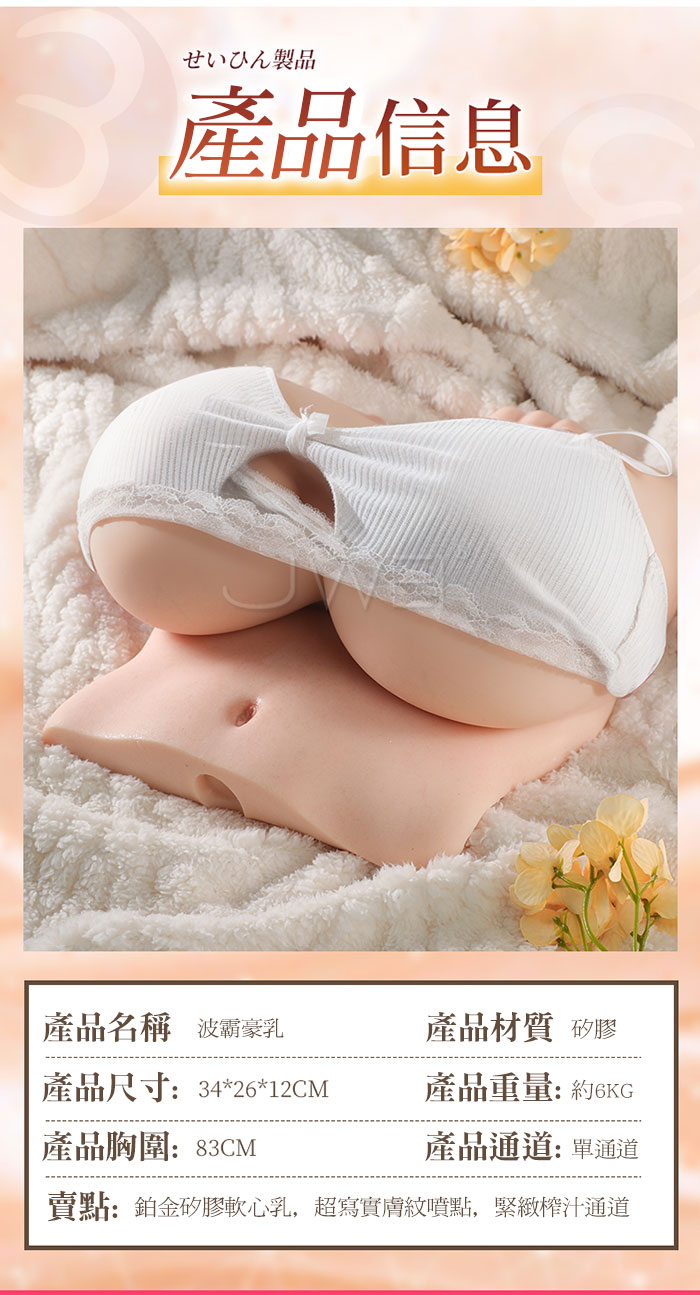 視覺衝撃soft!!超大胸圍 豪乳再現!!逼真還原模特胸器~ 玉兔不倒~X罩杯壓倒性軟心質感,倒臥自然擴散 真人復刻細節取勝,化妝級膚色噴點工藝,漸變乳暈效果 豆乳般手感,超大尺寸單手難以掌控!讓你愛不釋手!! ■尺寸:大小詳如圖片標示 ■材質:TPE ■重量:約6kg ■特色:鉑金矽膠軟心乳、超寫實膚紋噴點、緊緻單通道