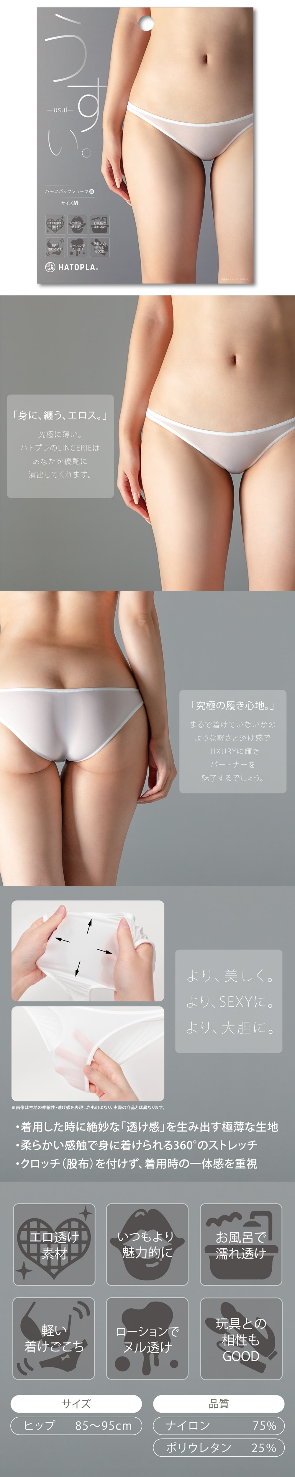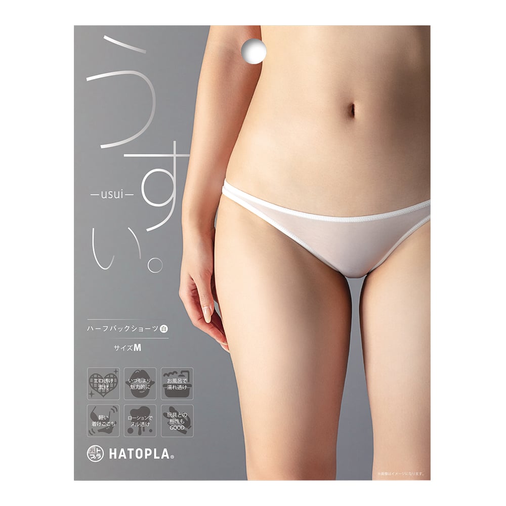 《うすい。-usui- ハーフバックショーツ(白)》 「身に、纏う、エロス。」究極に薄い。 ハトプラのLINGERIEはあなたを優艶に演出してくれます。 より、美しく。より、SEXYに。 より、大胆に。まるで着けていないかのような軽さと透け感で LUXURYに輝きパートナーを魅了するでしょう。 恥ずかしく…大胆に。輝かしく…上品に。 サイズ:ヒップ85~95cm /品質:ナイロン75%・ポリウレタン25% 《薄。-usui-半背內褲(白)》 「穿出性感。」極致纖薄。 Hatopura 內衣將提升您的性感魅力。 更美。更性感。更大膽。 輕盈透明,宛如空無一物,閃耀奢華光芒,捕捉您的伴侶。 羞澀……大膽。璀璨……優雅。 尺寸:臀圍 85-95 公分