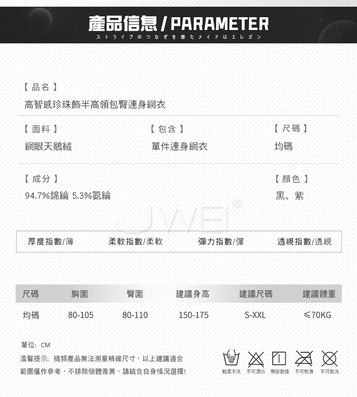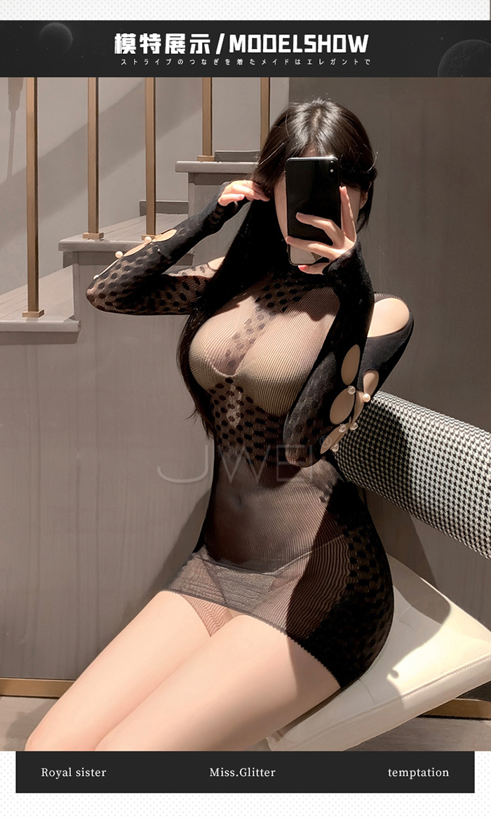 鄰家姐姐.高智感珍珠飾側鏤空長袖半高領包臀連身網衣-紫【單件網衣】