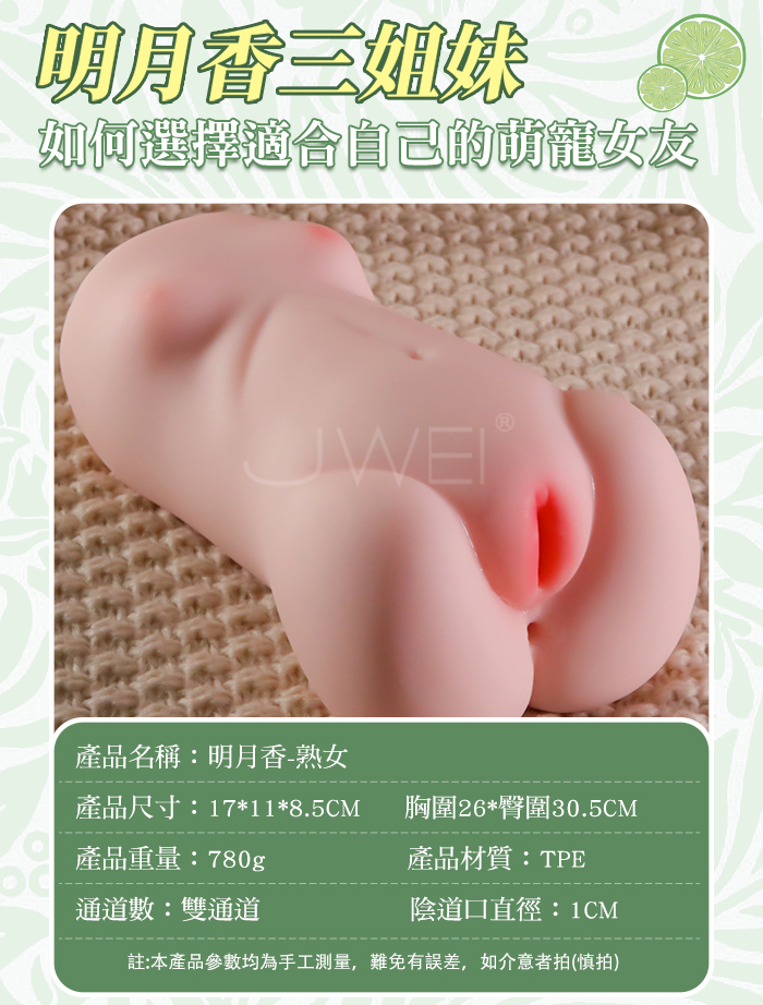 “享受二次元的絲滑愉悦”擬真模特兒“明月香姐妹” 作為半身名器的明月香有著特別之處: 1.飽滿的小饅頭私處 2.Q彈肉厚的杯體 3.桃花深處的大顆粒 每一次的觸動都是身心的滿足~~ 產品規格 ■尺寸:大小詳如圖片標示 ■材質:TPE ■重量:約233g