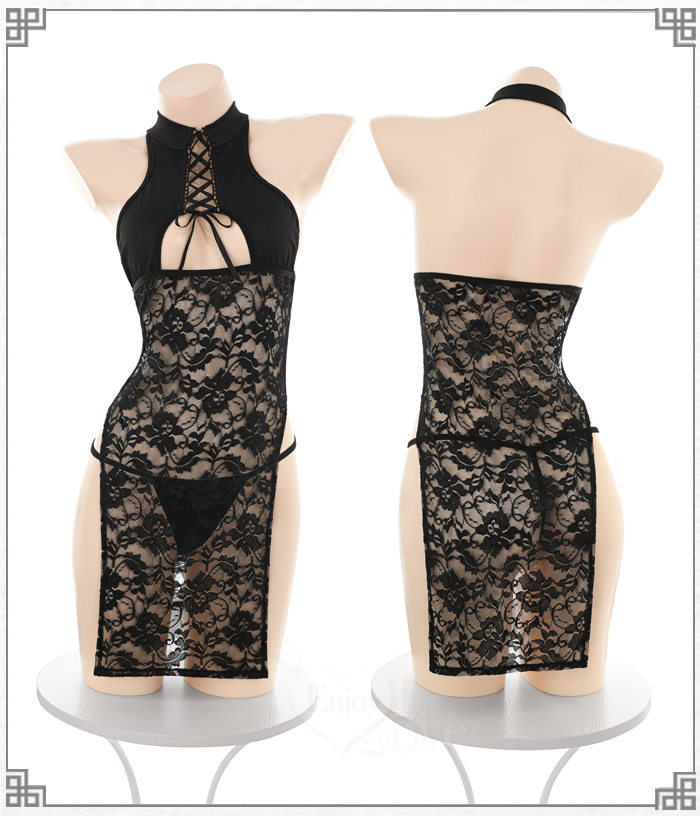 仿旗袍睡衣|立領綁帶緹花蕾絲・側高衩性感連身裙三件組