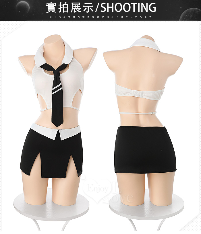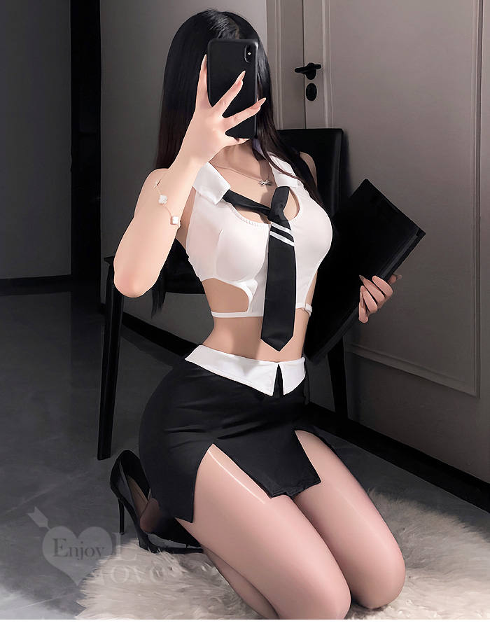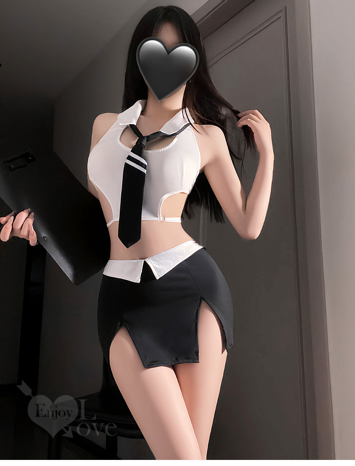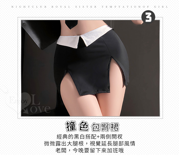 秘書角色扮演服!細帶露腰短上衣撞色雙開衩包臀裙四件式套裝