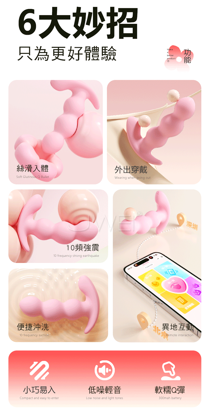 緋櫻拉珠 新手爽玩!10頻強勁震感 層層遞進! 軟糯矽膠,舒適入體“柔軟不疼”外震蜜豆,挑逗咪咪 遠程控制,指尖把玩“距離不在是難題” 產品規格 ■材質: 矽膠+ABS ■規格: 詳如圖片標示 ■功能: 10頻震動、APP智控