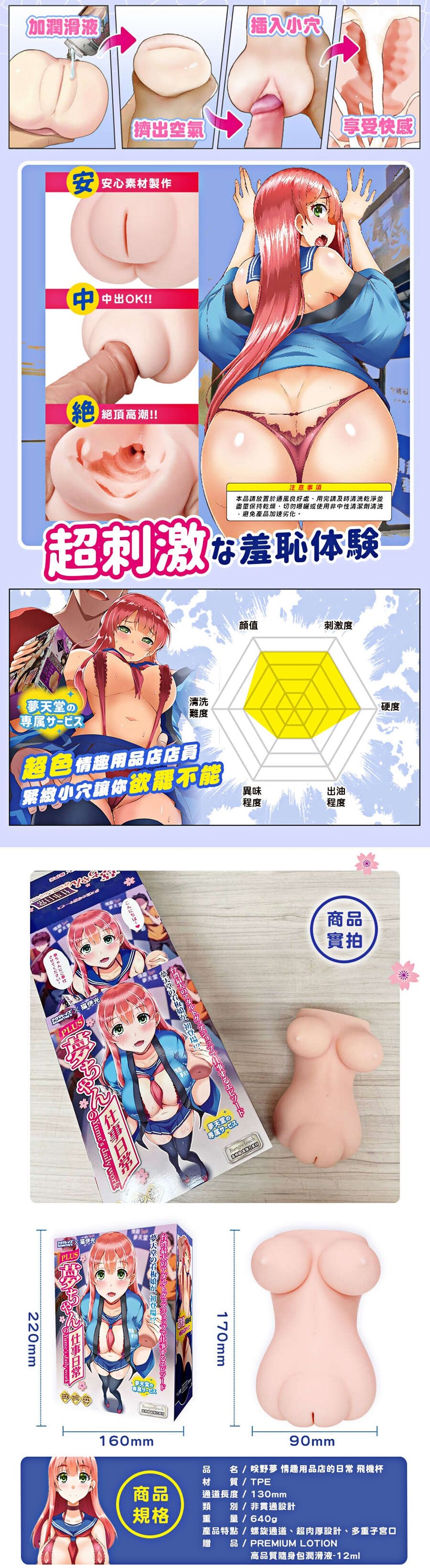 用途:男性自慰之用 材質:TPE 規格:手動型/非貫通 淨重:約640g 總重:約922g 尺寸:長17x寬9cm 外盒尺寸:22x16x10.2cm 產地:中國 注意:請與潤滑液共用.並保存於陰涼處,欲重覆使用.用後清水沖洗。 ※情趣用品屬於個人衛生用品,經拆封使用,無法接受退換貨!※ ※每台電腦的解析度皆不同,可能有些微色差,顏色皆以實品為主!※