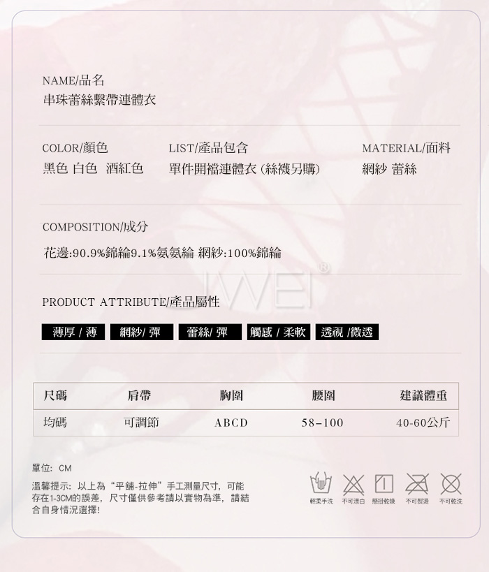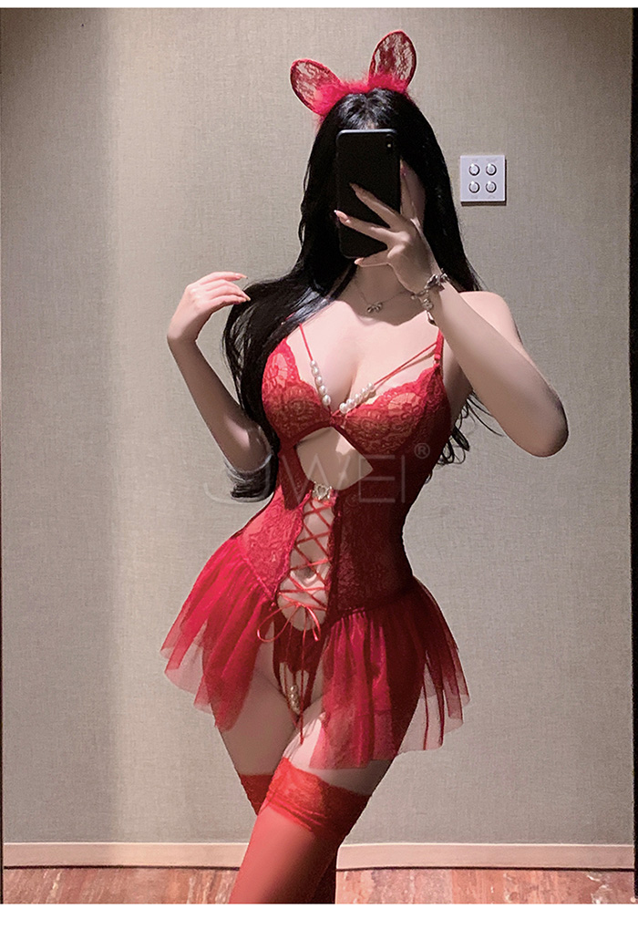 ►您現在的位置:首頁>串珠織夢.深V珍珠飾胸蕾絲繫帶花邊裙擺開襠連體衣【酒紅】