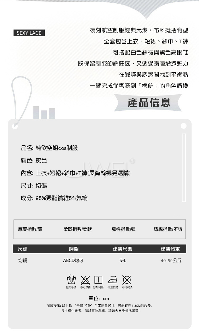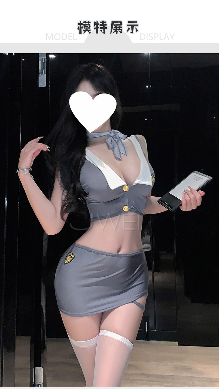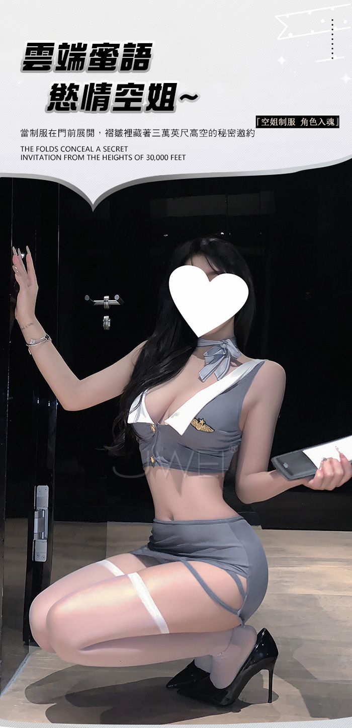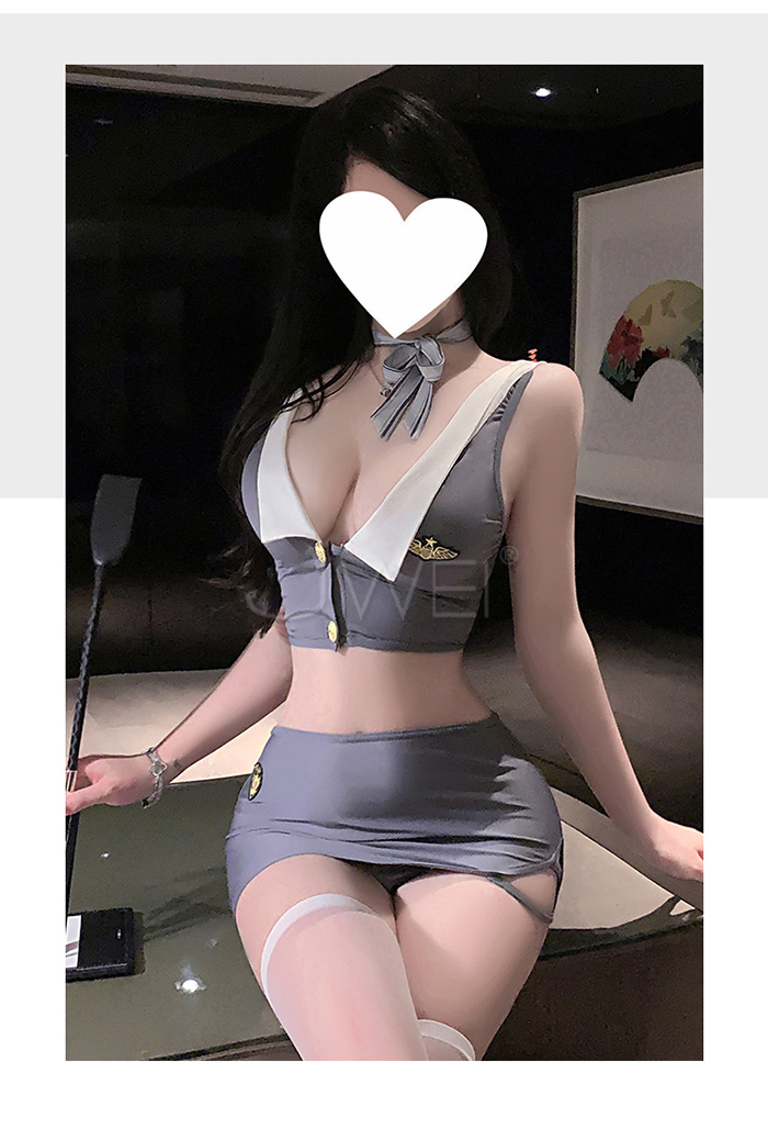 首頁>雲端蜜語.深V露溝裙襬鏤空包臀慾情空姐套裝【上衣+短裙+絲巾+T褲】