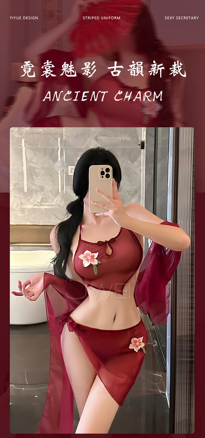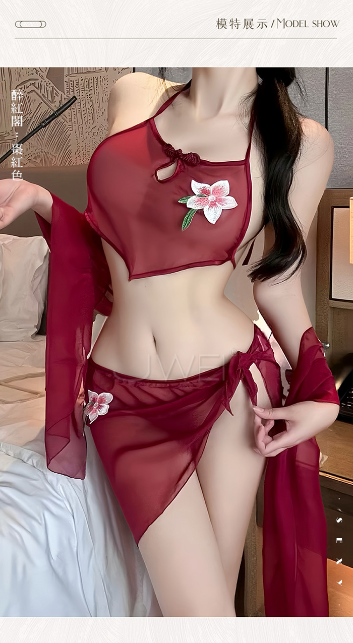 | 霓裳魅影.薄紗透視美背繫帶古風舞姬肚兜套裝【肚兜+短裙+披肩-棗紅】