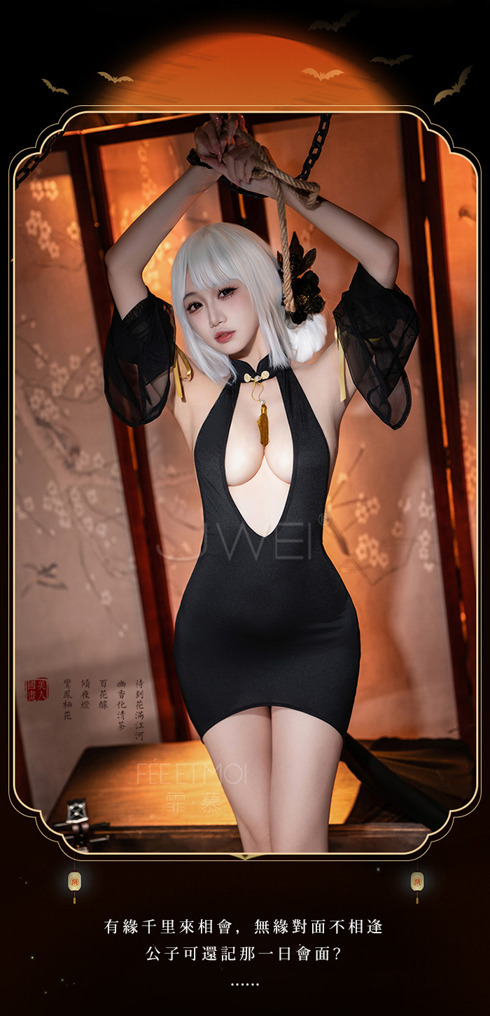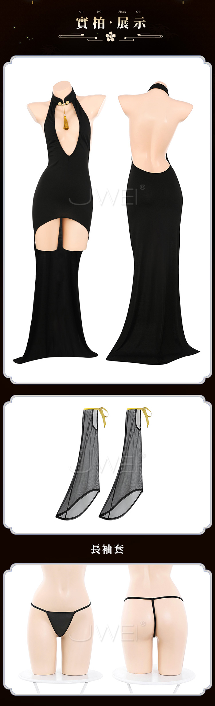 ►您現在的位置:首頁>尤物魅骨.深V性感露溝美背分割飄逸長裙襬旗袍【連身裙+袖子*2+T褲】