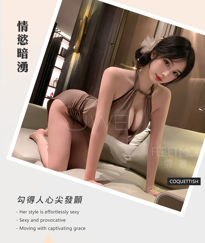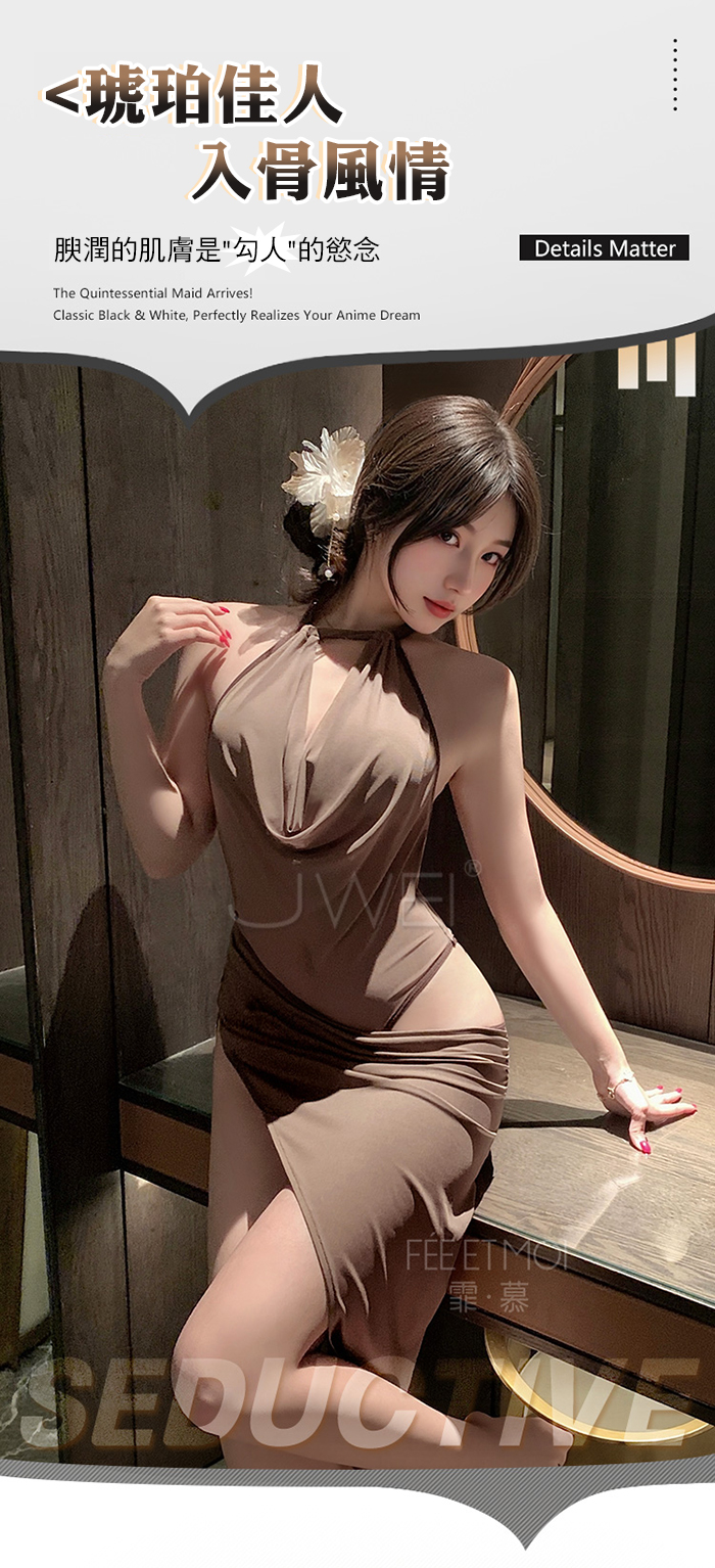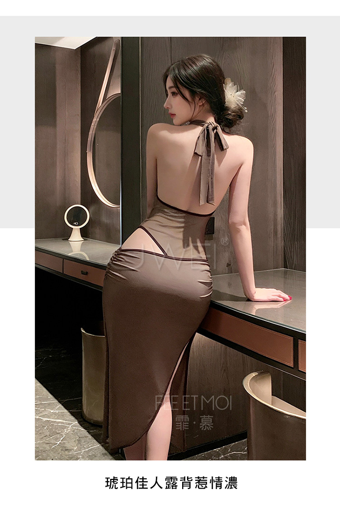 | 琥珀佳人.高雅深V蕩領裸紗透視側高衩連身裙